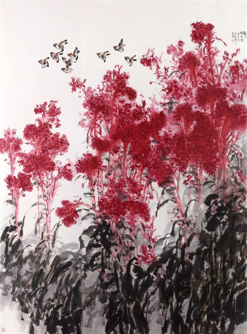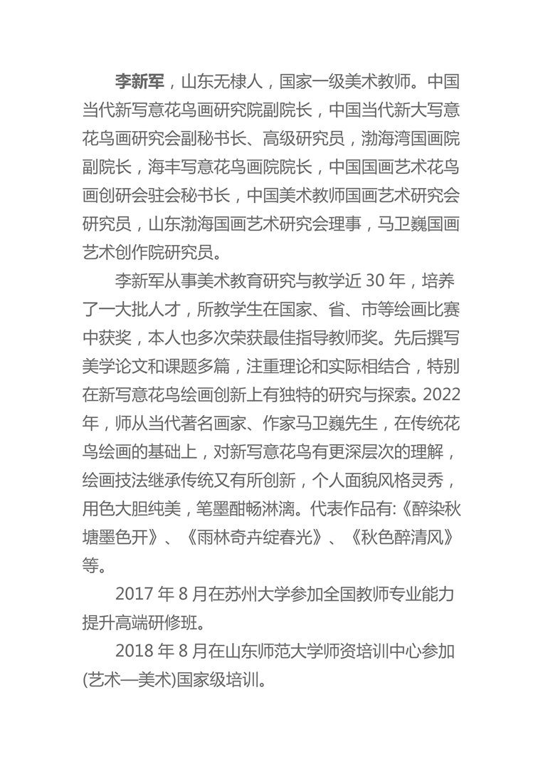 李新军从事美术教育研究与教学近30年,培养了一大批人才,所教学生在国家、省、市等绘画比赛中获奖,本人也多次荣获最佳指导教师奖。先后撰写美学论文和课题多篇,注重理论和实际相结合,特别在新写意花鸟绘画创新上有独特的研究与探索。2022年,师从当代著名画家、作家马卫巍先生,在传统花鸟绘画的基础上,对新写意花鸟有更深层次的理解,绘画技法继承传统又有所创新,个人面貌风格灵秀,用色大胆纯美,笔墨酣畅淋漓。代表作品有:《醉染秋塘墨色开》、《雨林奇卉绽春光》、《秋色醉清风》等。