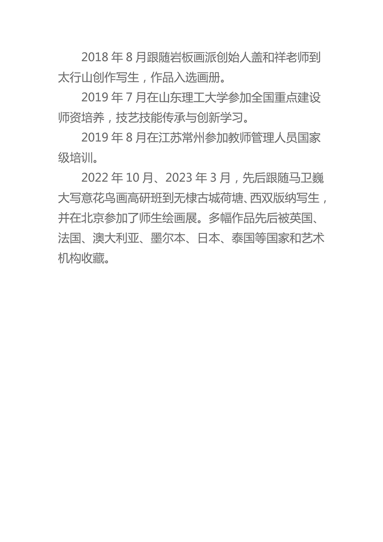 2022年10月、2023年3月,先后跟随马卫巍大写意花鸟画高研班到无棣古城荷塘、西双版纳写生,并在北京参加了师生绘画展。多幅作品先后被英国、法国、澳大利亚、墨尔本、日本、泰国等国家和艺术机构收藏。